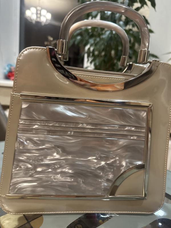 Сумка лакована в ретро стилі З перламутровою панеллю вставкою , із золотистою фурнітурою і з закругленою ручкою теж під перламутр Сумка із лакованої шкіри з цупким корпусом Розмір сумки : висота -25 см ; ширина -27 см ; по дну 13 см Не буду стверджувати що шкіра натуральна , не маю такої ініормації ! Має ледь помітну рисочку , напевно від ручки або олівця На довгій ручці потрібно о поміняти карабін ( дивіться фото )