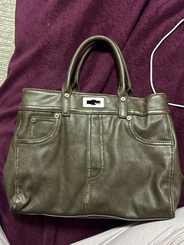 Гарна сумка зі шкіри, середнього розміру, коричневого кольору, має багато кишеньок, і магнітний замок