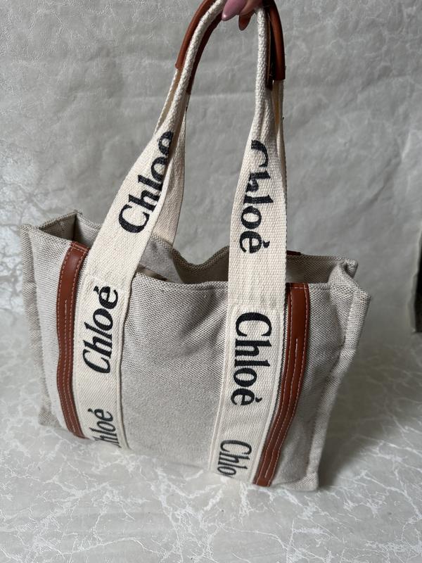 Це сумка-тоут Chloé Woody, популярна модель від відомого французького дому моди. Основні характеристики моделі: Дизайн: Сумка вирізняється сучасними лініями, підкресленими контрастними вертикальними шкіряними вставками та фірмовими стрічками з логотипом Chloé. Матеріали: Оригінальна модель зазвичай виготовляється зі лляного полотна (канви) з оздобленням із штучноі шкіри. Функціональність: Має містке основне відділення та практичну внутрішню плоску кишеню. Не значні сліди носки.