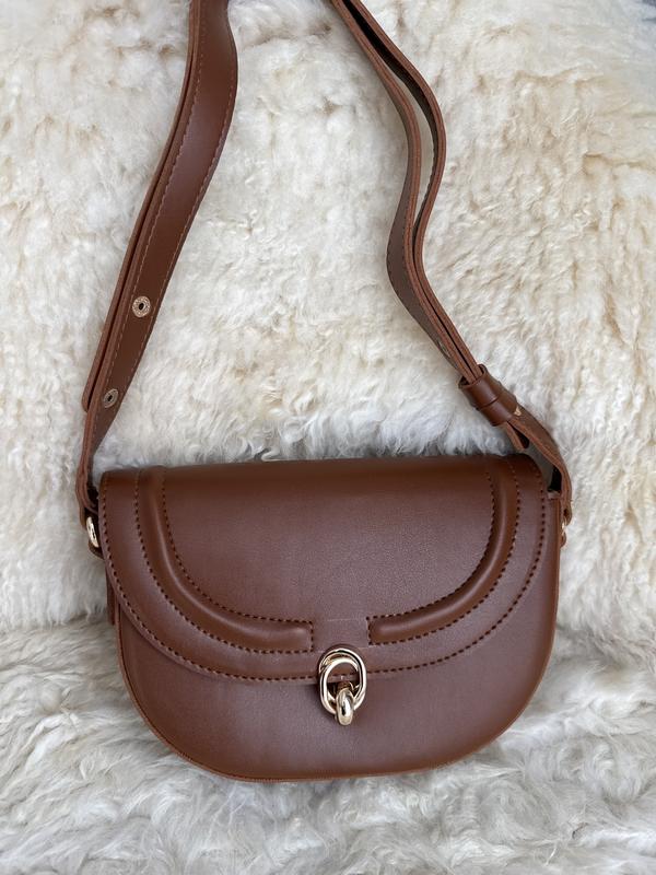 Компактна сумочка через плече у коричневому кольорі. • Класична форма з округлим клапаном • Регульований ремінь для носіння через плече або навхрест • Металева фурнітура золотистого кольору • Внутрішнє відділення з кишенею на блискавці • Підкладка темно-синього кольору • Декоративна строчка по контуру Ідеально підходить для щоденного використання - поміститься телефон, ключі та дрібні речі. Зручна для прогулянок та походів у місто.