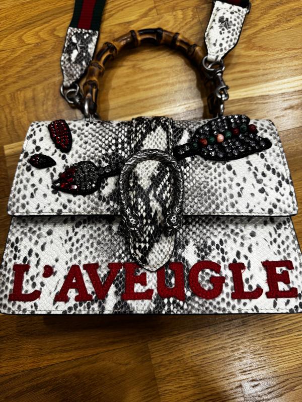 Ефектна сумка з натуральної шкіри пітона у чорно-білому принті. Модель доповнена фірмовою застібкою Dionysus зі сріблястою фурнітурою, декоративною аплікацією та бамбуковою ручкою. Має знімний текстильний ремінець для носіння на плечі. Стильний акцент для яскравих образів та поціновувачів люксових брендів.