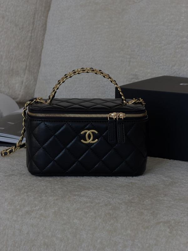 Сумка Vanity Logo Handle Premium Колір: чорний білий бордовий Усередині — текстильна підкладка, одне основне відділення та додатковий компактний відсік для дрібниць. Є нашитий фірмовий логотип, а також металевий логотип із серійним номером Сумка доповнена ручкою із золотою брендованою фурнітурою та металевим написом Фурнітура — брендована Для носіння через плече передбачений тонкий довгий ланцюжок із вплетеною шкірою ▪️ Розмір: 16 × 10,5 × 7 см ▪️ Матеріал: шкіра ▪️ Довжина ремінця: 118 см (не регулюється) ⭐️ Подвійна коробка + магнітна коробка , тишью , пильник , буклетики