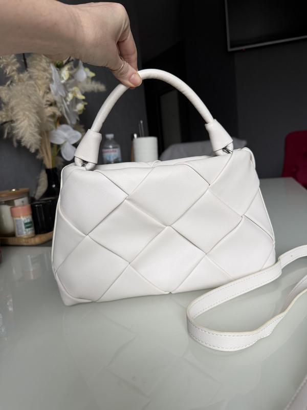 Сумка жіноча натуральна шкіра біла з короткою ручкою та довгим ремінцем, з плетінням повсякденна Polina&Eiterou