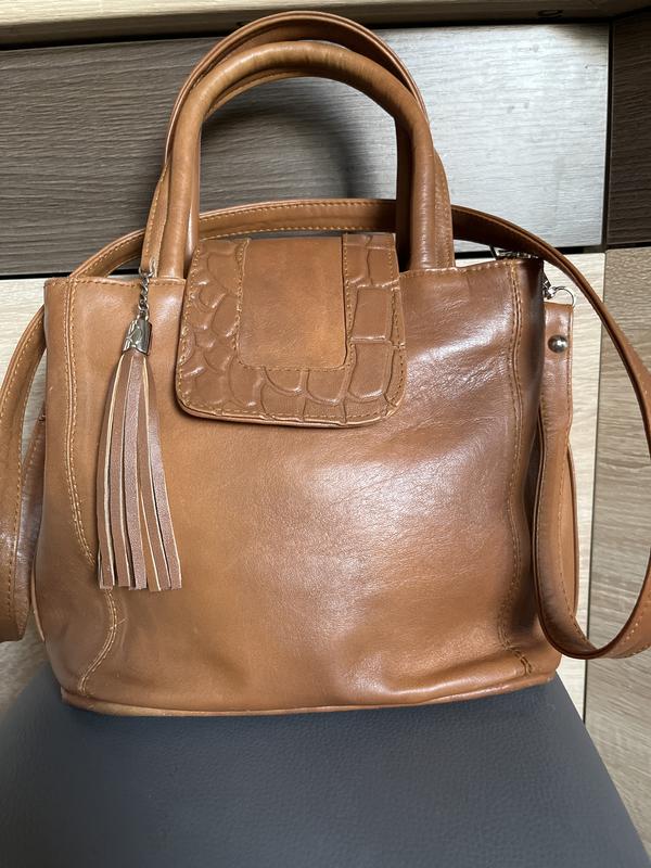 Це жіноча сумка через плече або сатчел, виготовлена з натуральної шкіри рудого кольору. Основні характеристики моделі: Дизайн: Сумка має структуровану форму з короткими ручками для носіння в руці та довгим ремінцем для плеча. Декоративний клапан зверху прикрашений тисненням під рептилію (крокодила), що додає акценту. Декор: Характерною особливістю є шкіряна підвіска-китиця (fringe), прикріплена до однієї з ручок. Матеріал: Шкіра має гладку фактуру з природним блиском, що характерно для високоякісних виробів. Є три великі перегородки,дві кишеньки (внутрішня і зовнішня). Була використана пару раз. Із нюансів : внизу ледь підтерта,що характерне при носінні шкіряних виробів (на останньому фото показано)