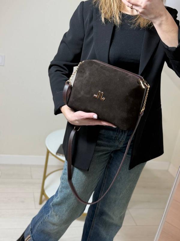 Новинка ! Сумка на 2 окремі відділи. Виробництво Україна. Код 5372 💳1060 грн Натуральна замша та екошкіра структурована. Фурнітура золото. 26х18х9,5 Максимальна довжина ременя 150 см. Два відділи на блискавці. Всередині кишеня відкрита. На звороті кишеня на блискавці.