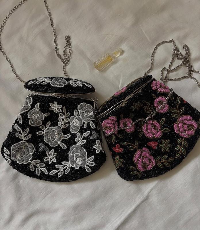 Лівий фермуар /сумочка: 750📮 має чорну основу і вишитий бісером сірого та білого кольорів. Візерунок складається з квітів (схожих на троянди) і листя. Гаманець має металевий каркас і застібку-поцілунок (поцілункова застібка), а також тонку сріблясту ланцюжкову ручку. 2. Правий фермуар /сумочка: -750📮 також має чорну основу. Він вишитий яскравим бісером рожевого, зеленого та, можливо, червоного кольорів, також формуючи квітковий візерунок (троянди та листя). У нього також є металевий каркас