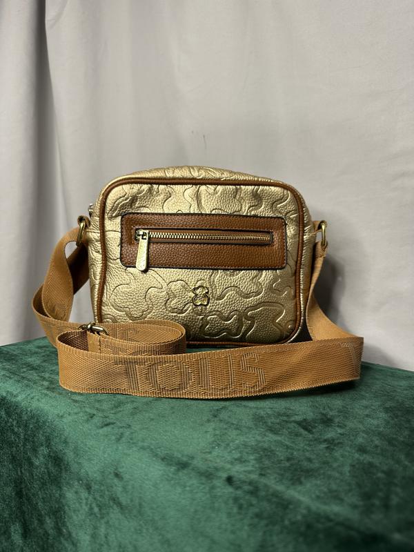 Золота та Коричнева сумка бренду tous У форми кросс боді Довгий ремень регулюється Одне велики відділення та маленьке для дрібнички Нюанс позаду на останньому фото При носці не помітно Взагалі гарний стан
