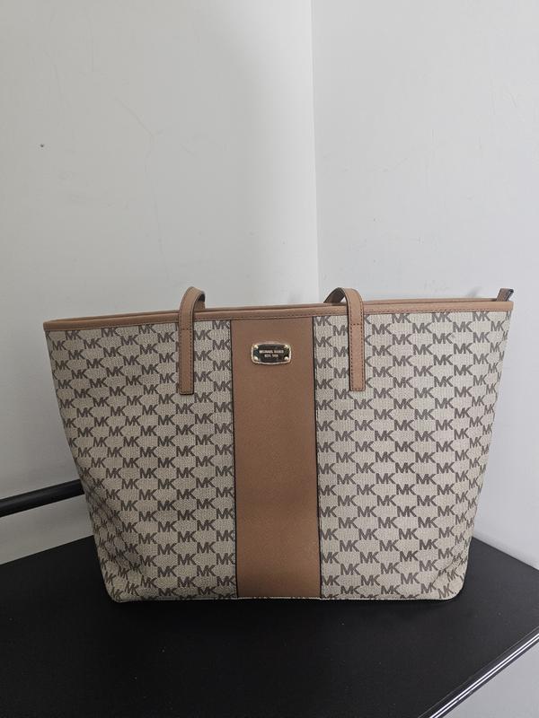 Это сумка-тоут от известного американского бренда Michael Kors. Сумка выполнена в фирменном стиле бренда с логотипом "MK" (Signature print). Характерной особенностью является широкая вертикальная полоса по центру (Center Stripe) контрастного коричневого цвета. Изделие имеет золотистую фурнитуру включая металлическую пластину с логотипом бренда на фронтальной части. Основной материал сочетает канву с фирменным принтом и элементы из натуральной кожи. Большая сумка-шоппер (tote), вмещающая формат А4. Основное отделение закрывается на молнию, имеет подкладку с логотипом MK, один карман на молнии и несколько накладных карманов для мелочей. Размер : высота 29, длина 47, по дну 36*17.