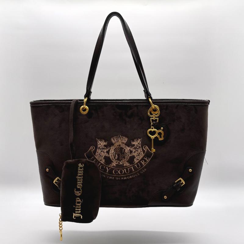 Сумка Juicy Couture Якісна фурнітура під золото Сумка-шопер в шоколадному кольорі під замшу. Дуже велика та містка. Підійде для навчання, подорожей, роботи чи спорту Має три внутрішні відділи та три внутрішні кишені. Також додатковий гаманець з карабіном на обвіс з різними брелоками Заміри-> Довжина: 47см Висота: 26см Ручка: 48см +оригінальна підвіска з брелоками та гаманець 14*8см