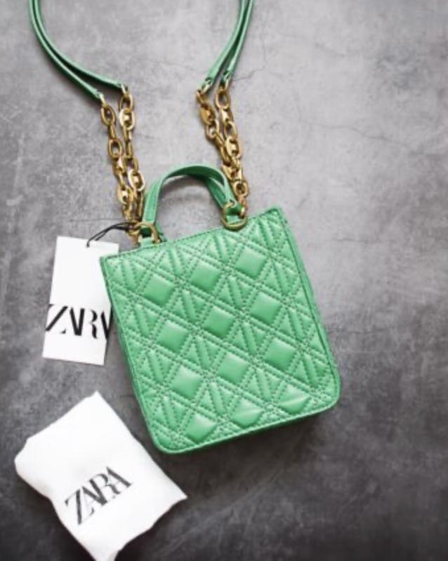 Сумка Zara — зелена стьобана міні-сумка з ланцюжком через плече та подвійною строчкою. Оригінал. Нова