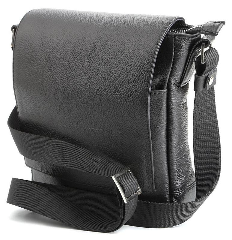 Материал: натуральная кожа высокого качества. Цвет: черный. Размеры (ШхВхГ, см): 18х18х6см. Страна производитель: Украина. Компактная мужская кожаная сумка через плечо украинского производства. Кожа, из которой выполнен данный аксессуар, приятная на ощупь и имеет зернистую фактуру. Цвет фурнитуры: серебро. Сумка закрывается при помощи клапана на двух скрытых магнитах и металлической молнией. Под клапаном расположен накладной карман. На задней внешней стороне данного аксессуара находится отделения на молнии. Сумка носиться через плечо при помощи регулируемого текстильного плечевого ремня. Внутри: - одно основное отделение; - кожаный накладной карманчик для мобильного телефона (на передней стенке); - потайной карман на молнии (на задней стенке).