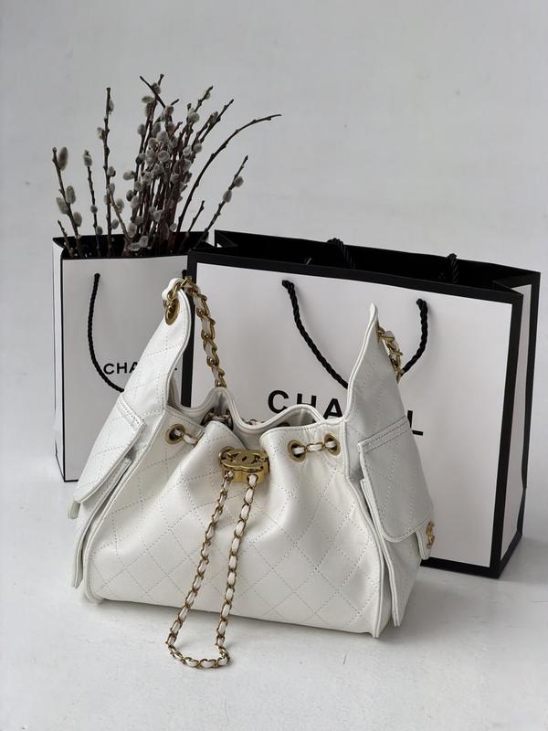 Сумка жіноча Chanel 25 Small Handbag Код білий 20205-3 Сумка виготовлена зі шкіри з вираженою зернистою фактурою. Зачиняється за допомогою шнурка та має два зовнішні бокові кишені на магнітах. Усередині — одне основне відділення, відкрита кишеня та ще одна кишеня на блискавці. Також є нашитий тиснений логотип, бірка з серійним номером і QR-кодом. Матеріал: шкіра Розмір сумки: 27*20*13см Сумку можна носити на плечі завдяки переплетеному плечовому ременю (висота — 30 см). Фурнітура — у золотистому кольорі, з брендованими елементами ⭐️ Пильовик в комплекті