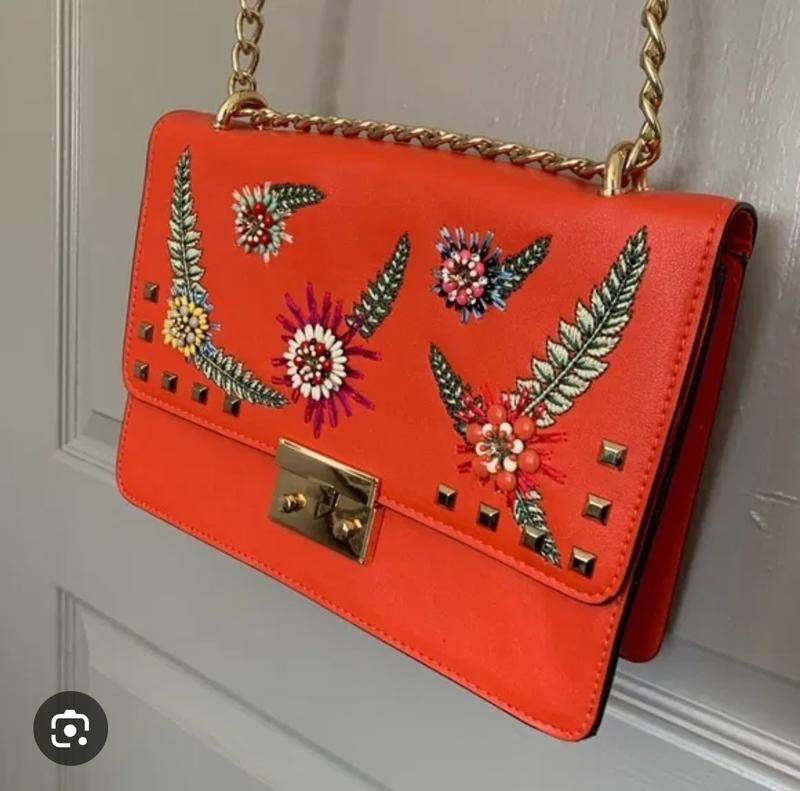 Эта яркая оранжевая сумка через плечо с вышивкой и бисером была выпущена брендом Primark. Основные характеристики Дизайн: Модель украшена детализированной вышивкой в виде цветов и листьев, дополненной бусинами, которые создают эффект мерцания. По бокам и на клапане расположены золотистые заклепки. Материал: Внешняя часть выполнена из искусственной кожи (экокожи). Детали: Сумка оснащена золотистой застежкой-защелкой и ремешком в виде цепочки.