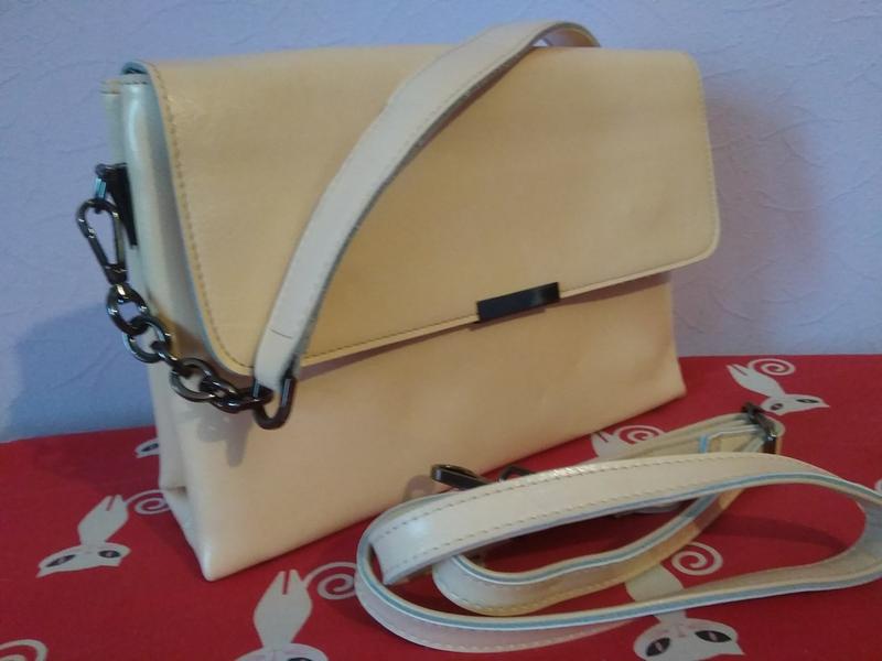 сумка кроссбоди, цвет - бежевый, есть короткая и длинная ручка, внутри 2 отделения, 1 внешний карман, 3 кармана внутри сумки. Кожа плотная. Размер ширина 28 см, высота 20 см, глубина 8,5 см. ВОЗМОЖЕН ОБМЕН НА НОВЫЙ БЕЖЕВЫЙ КОЖАННЫЙ РЮКЗАК.