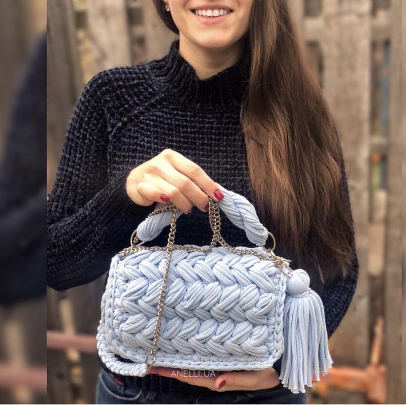 Продам сумку ручной работы. Выполнена из трикотажной пряжи, а значит легко стирается! Внутри небесного цвета подклад, закрывается на 2 магнитные кнопки. Под заказ можно в других цветах. 2 ручки: короткая и длинная через плечо, снимаются на карабинах