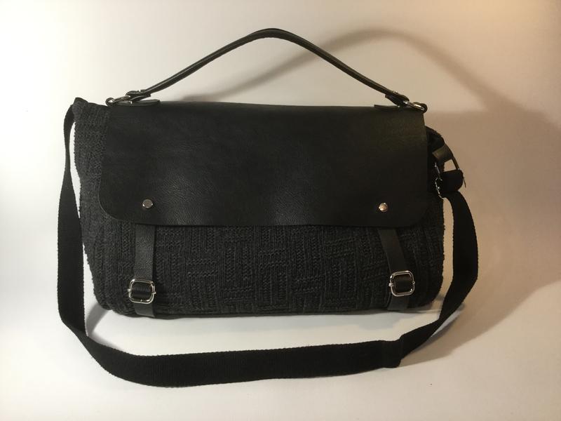 Стильная вязаная сумочка из эко кожи и вязазаный низ. Торговая марка Risskio Italy. Застежка 2 магнитные кнопки, внутри 1 отдел, 1 карман на молнии. Мерочки: ширина внизу 40,вверху 53; высота 35; глубина 10; длина ручки 41,шлейки 108.
