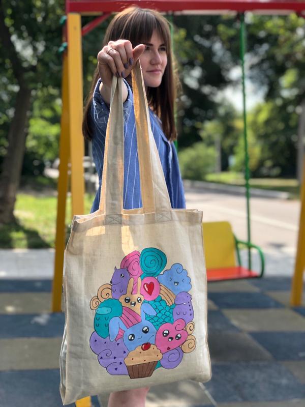 Эко-сумка - прекрасная альтернатива бумажным и полиэтиленовый пакетам. Она приятная на ощупь, удобная, вместительная и просто незаменима в летнее время. Благодаря длинным ручкам, эко-сумку удобно носить как в руках, так и на плече. Рисунок сделан вручную, что делает сумку более уникальной🍀
