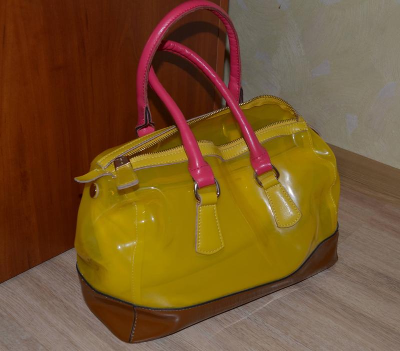 Різнокольорова водонепроникна сумочка, що поєднує на собі рожевий, жовтий (найбільше), та коричневий кольори. Можливо носити у двох варіантах: 1. з додатковим відділом, що не просвічується (1 фото). 2. без нього, в цьому випадку, практично увесь вміст сумки буде видно на 65%. Додатковий відділ кріпиться на застібки (2 фото) з обох боків усередині, та має три бокових кармани, один з яких на замку. Форма бочечки. Довжина 22 см, ширина 30 см. Довжина бокових частин 14 см. Довжина ручок 16 см. Тверда основа.