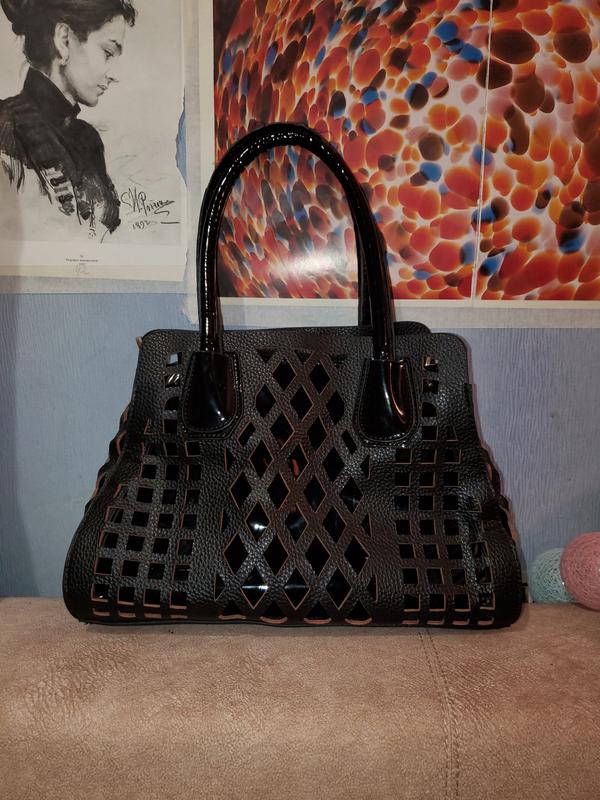 Сумка перфорация, внутри вторая лаковая сумка, на обеих есть кольца для ремней, но длинных ремней-ручек нет. Состояние отличное, но на ручках кое-где отсутствует кант спаек ласкового материала, в носке не видно, предпоследнее фото. Замеры по запросу. Возврат не предусмотрен.