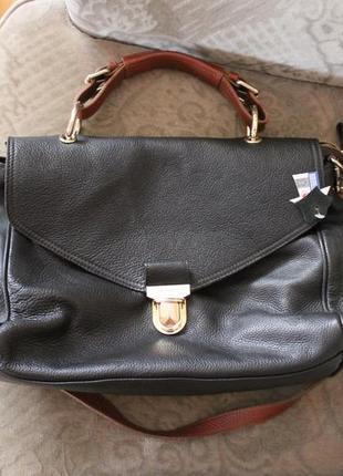 Нова, куплена в Іспанії, шкіряна.Розміри : довжина 34см, ширина дна-11,5см,висота - 30см,довжина довгої ручки-97см без карабінів. Фурнітура жовтого кольору,ручки збоків не проклеєні.
