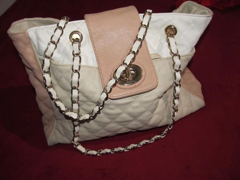 Сумка в стилі Шанель, триколірна (білий, пудровий і бежевий) вместительня на три відділення і зовнішнім кишенею.