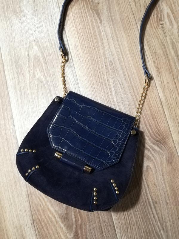 Безумно красивого насыщенного синего цвета. Материал: под замш. Внутри 1 отделение, 1 карман на застежке и 2 маленьких карманчика. Размер: - длина 21 см. - высота 20 см.