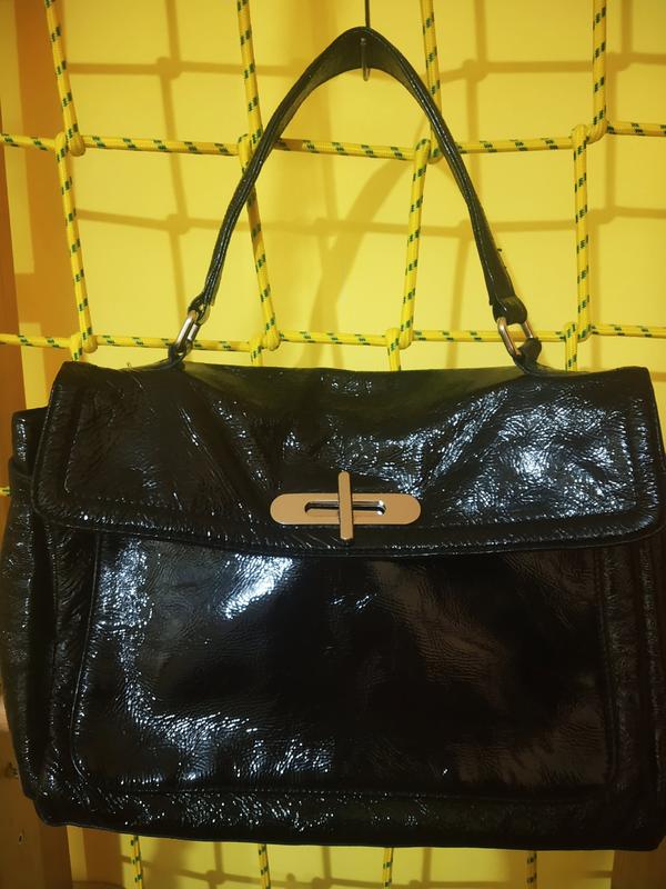Сумка из лакового кожзама. Стан идеален. Два маленьких кармана и один на молнии. Нашла маленькую трещинку сбоку, где собирается сумка (последняя фото).