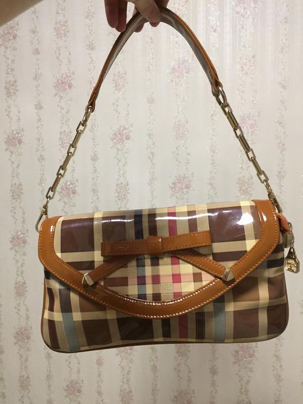 Лаковая сумочка в клетку на средней длине ремешке,с наружным и внутреннему кармашками на молниях,размер 31 см# 19 см
