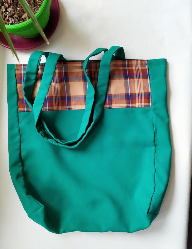 Шоппер зелёного цвета, ткань - габардин. Есть подкладка, в ручки вшита ременная лента для прочности и удобства. По бокам есть вставки для большей вместительности. Сшита аккуратно. Размер: 33×42×8 см, ручки по 64 см.