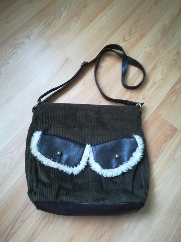 Сумка новая, экокожа, вельвет, экомех. Очень интересная, приятная в руках. Фурнитура под медь. Высота 30 см, ширина 30 см, ширина боковины и дна 8 см. Полудлина ручки 65 см. Застегивается на молнию, внутри карман на молнии и два карманчика без застежек.