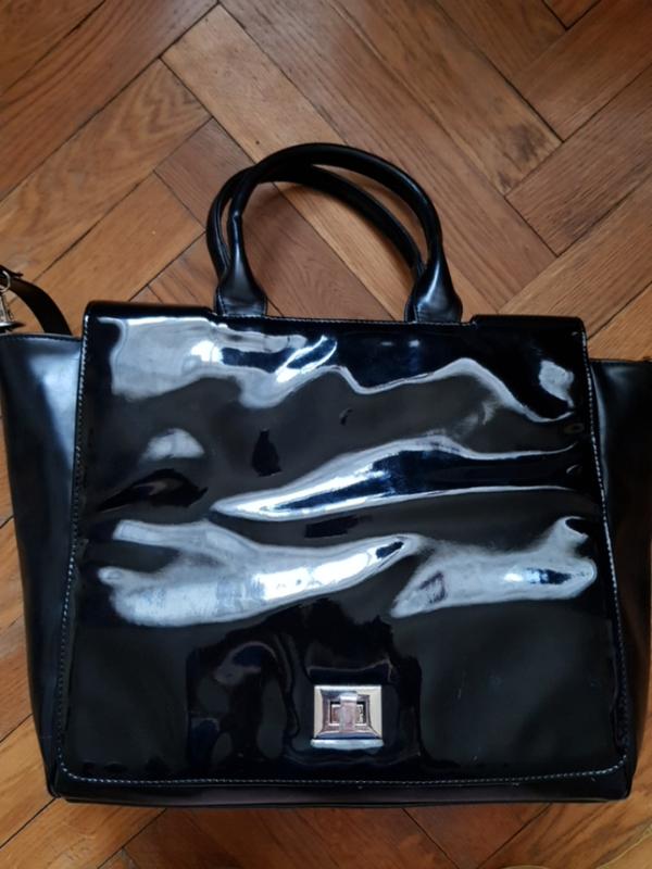 сумка из эко кожи. комбинированная лак-кожа. длинная ручка отстегивается. 2 основные маленькие ручки- длина позволяет носить на локте на верхнюю одежду. внутри большой средний карман на змейке, маленький карман на змейке, 2 маленьких кармана размер 35х29х17. ооочень вместительная..!!! (папки с документами плюс все необходимое помещаются свободно). состояние идеальное. дефект- на длинной ручке один карабин поменян- сделаю скидку