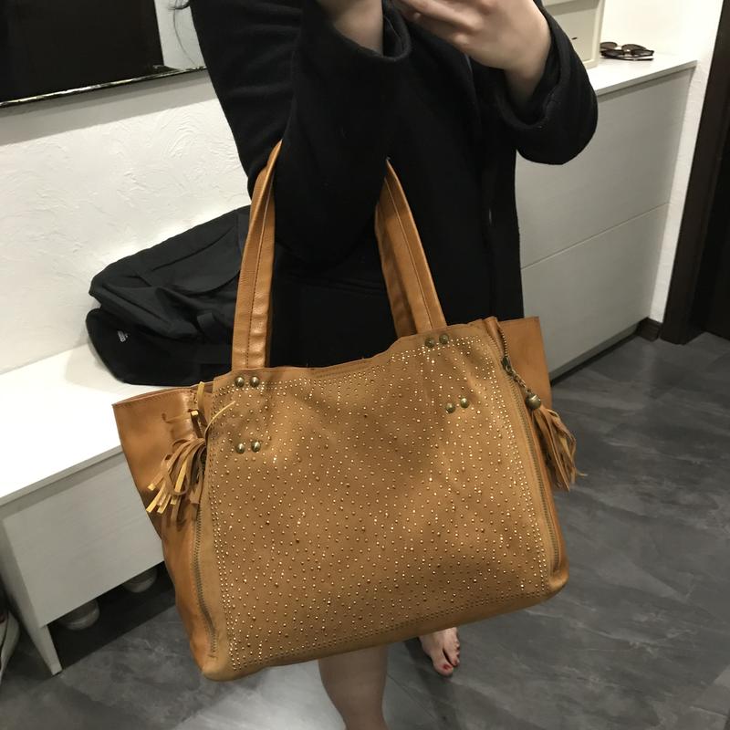 Продам шоппер в хорошем состоянии Очень вместительная, защёлкивается на магните Внутри есть дополнительная косметичка для удобства Состояние в целом хорошее, пару стразиков отпало, но это не портит общей картины Сумку можно расширить с помощью замков спереди