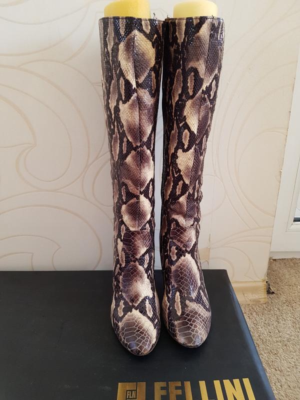 чоботи шкіряні, пітон. р. 37, середній каблук. дуже ефектні і зручні . На одній шкарпетці - дефект,тріснула шкіра в місці з'єднання з підошвою.
