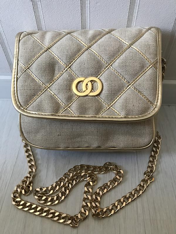 Сумочка с длинной ручкой-цепочкой.Тканевая с золотым напылением.Внутри два отделения и карманы.