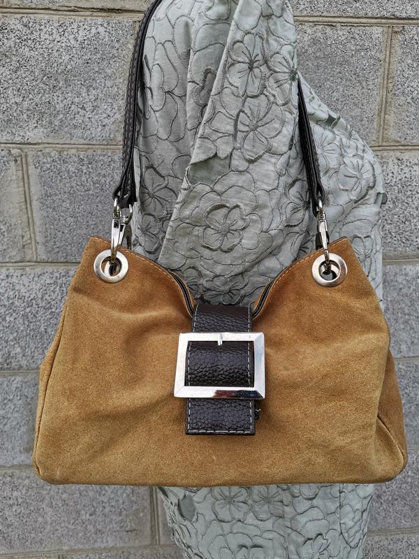Сумка из натуральной замшевой кожи +дно и ручки кожзам. Состояние очень хорошее без дефектов. Сумка идёт без лейб и этикеток. Сумка имеет одно основное отделение, перегороженное карманом на молнии. Сумка закрывается на кнопку магнит +хлястик с кнопкой магнитом. Длинна ~25 Высота ~19 Глубина ~11 Ручки ~52