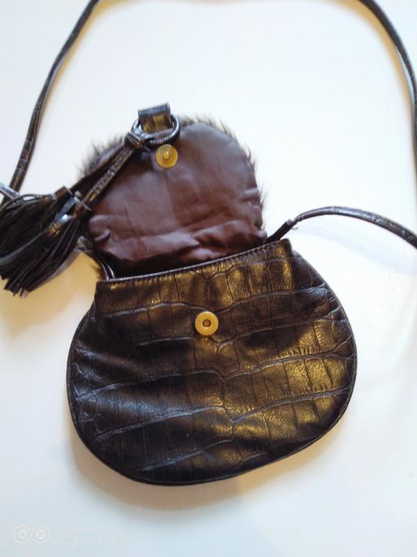 красивая, маленькая сумка не кожа, в хорошем состоянии, на кнопке, украшена искуственным мехом.