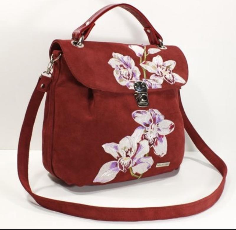 Сумка з натуральної замші кольору розкішної охри, з вишивкою ніжних орхідей. Модель закривається на блискавку, всередині має одне відділення, 2 містких навісних кишеньки і 1 кишеня на блискавці. Ручна робота. Розміри: 23х27х14 Довжина маленької ручки: 27 см Довжина додаткової ручки: 95 див.