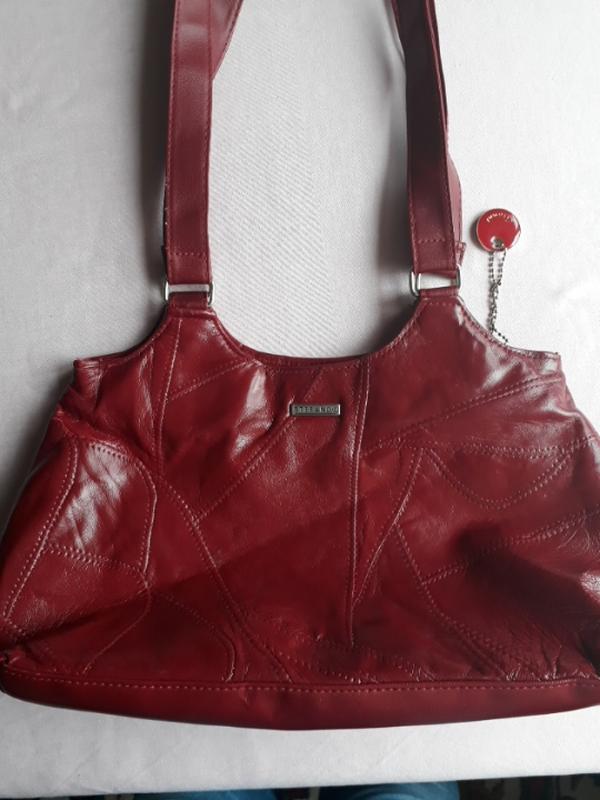 Красная кожаная сумочка с ручками на плечо.