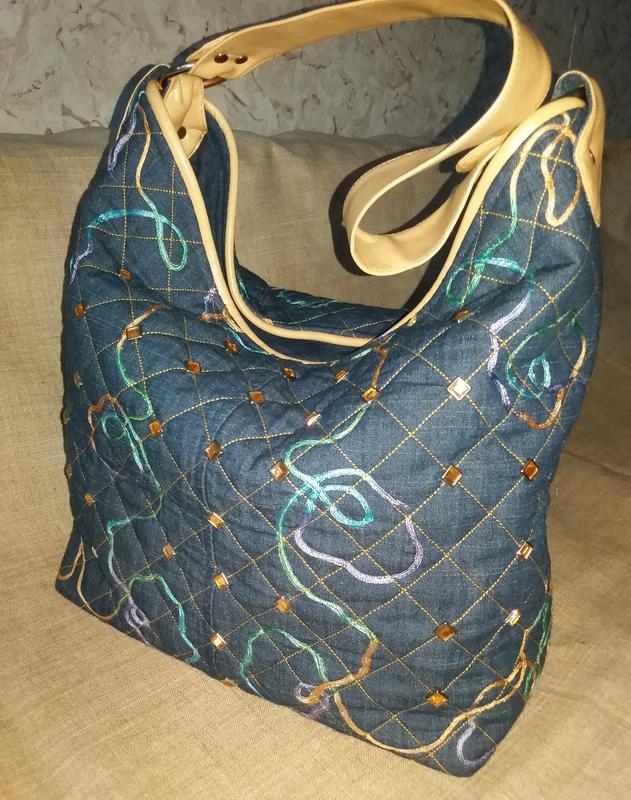 Джинсовая сумка.Ручная работа. Удобная, вместительная, функциональная ,объёмная сумка. Материал - комбинация джинсовой ткани и кожзаменителя. Аксессуары - бежевые. Сумка закрывается на молнию. Одна средняя нерегулируемая ручка. Сумка украшена металлическими стразами, заклёпками. Внутри - тканевая подкладка, одно большое отделение. С одной стороны - карман с клапаном на кнопке, с другой - места для мобильного телефона и документов. Размеры: 35x30x15 см.