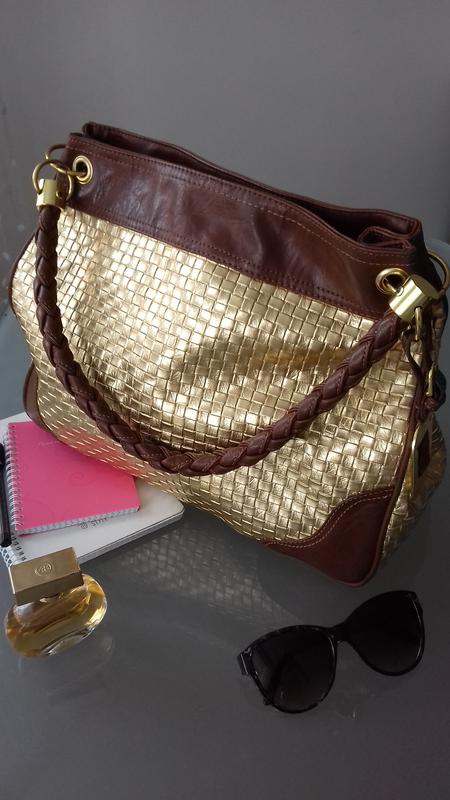 Супер сумка!!! С одной ручкой, с золотистым металлическим брелком. Подкладка очень приятная в цветочный принт. Внутри один отдел, есть три карманчика, один на молнии. Глубина - 31 см. Ширина внизу - 38, сверху - 32. Ширина нижней и боковых деталей - 14 см. Длина ручки - 32 см. Дефектов нет, только немного в верхней части возле ручок - потертости (см. Фото) они абсолютно незаметны!
