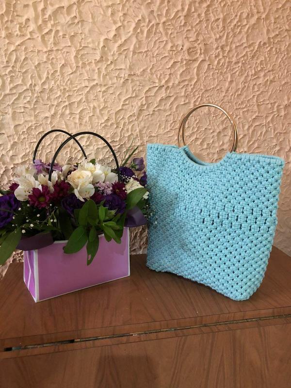 Макраме щільна красивого блакитного кольору. Ручки метал золото висота 30 ширина 33 дно 10