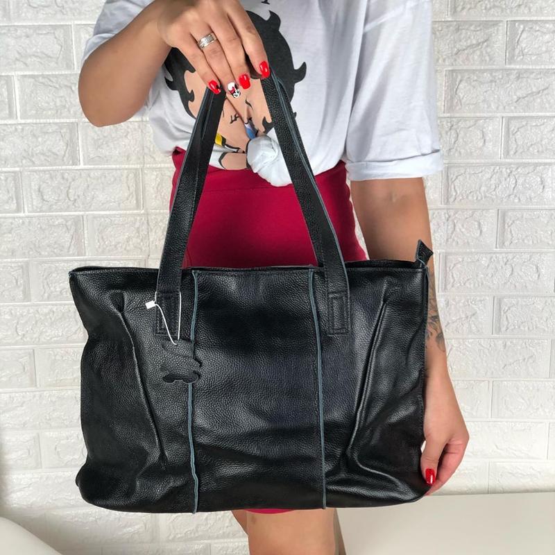 Сумка - мішок з натуральної м'якої шкіри Розмір : 32/45 см Висота ручки 26 см Одне відділення на блискавці, по середині перегородка на блискавці, внутрішні кишені Із зворотного боку кишеню робочий Ціна : 1470 грн