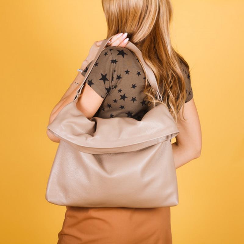 Сумка кожаная арт. 902728 Внутри одно отделение, 1 карман на молнии и 2 для мелочей.Размеры:ширина 43 см высота полностью 50 см, до сгиба 33 см,длина ручки 49 см Материал натуральная кожа Цвет Бежевый