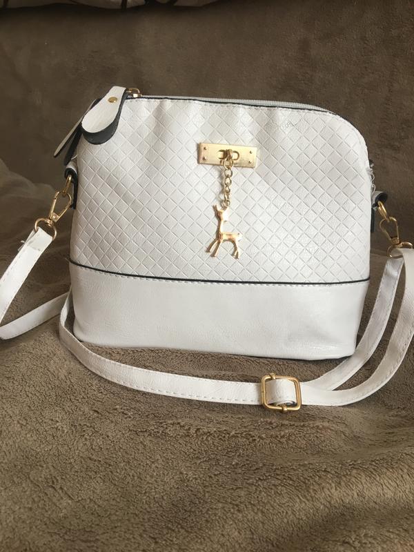 Сумочка на одне відділення без карманчиків на довгому ремінці що регулюється. Розмір 24/18/10 Нова, якість на трієчку але як для дівчинки може бути гарним подарунком. Є нюанс на останньому фото. Діє акція: дві речі купуєте, пара сережок на вибір у подарунок