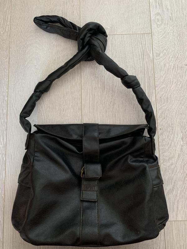 Крутая сумка esprit, немного с эффектом потертой кожи Ручка длинная, позволяет делать завязки на удобную длину. Длина ручки - 72 см. Внутри целая, замок исправен Размер - 31х23 см.