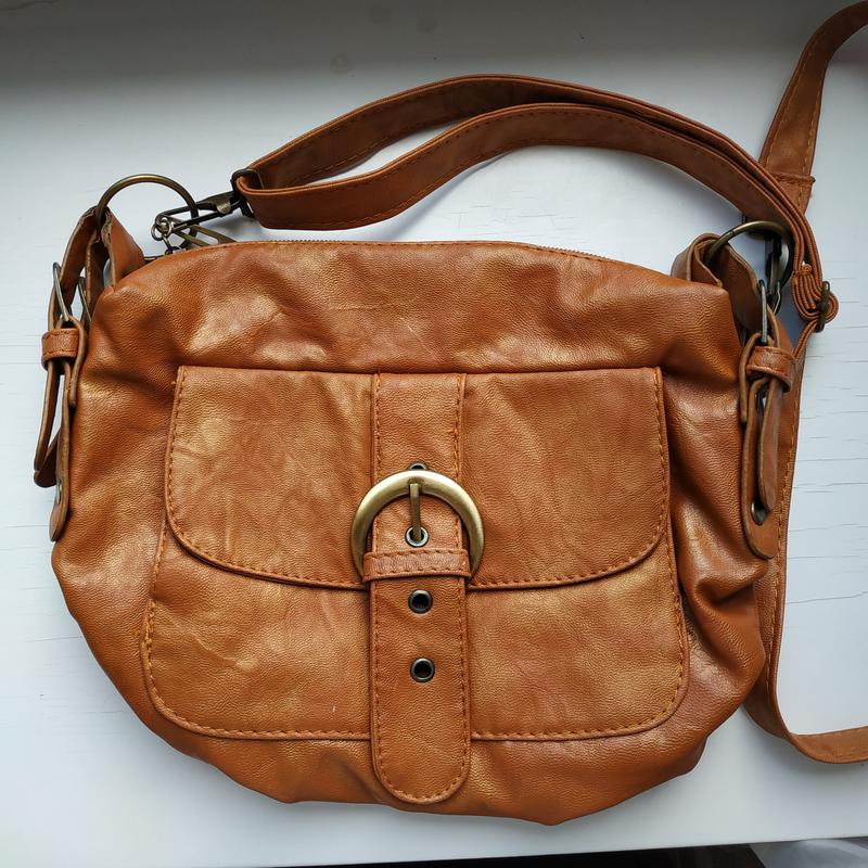 Сумка через плече, матеріал замінник, виробництво Китай. Спереду є кишенька на застібці магніт. Головний відділ на блискавці. Щільна підкладка. Довга ручка знімається якщо не потрібна. Маленька, містка середніх розмірів сумочка. Довжина ручки регулюється, вся довжина більше ніж 109 див. (не перетягувала на всю, заміряла як зараз є). Відмінний стан, з ізьянов на кільці збоку відшарувався замінник. Розміри: ширина 27 см висота 22 см