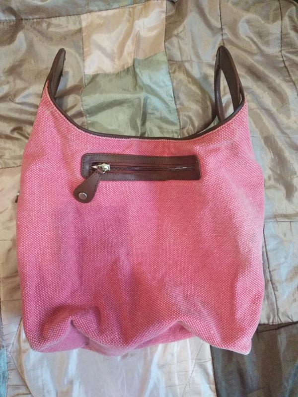 Сумка рожева з щільної тканини, фірми Cavalier, якісна. Нестандартної форми, на застібці-магніті, містка. Має 3 вшитих великих кишені зовні на блискавці, один кишенька на блискавці збоку всередині (останнє фото), а також кілька дрібних внутрішніх бічних кишеньок без застібок. Ручки і фурнітура з фарбованої коричневої шкіри хорошої якості, не облізлі, не подерті. Ручки-кільця зручні, зовнішній діаметр - 15 см, внутрішній - 10 див. Всередині підкладка також з щільної тканини, ціла, але має пару коричневих плям біля кишеньок (після прання колір перейшов з шкіряних вставок і облямівка навколо кишеньок на тканину підкладки), на функціональність не впливає, вада знаходиться зсередини, тому зовні не помітний (останнє фото).