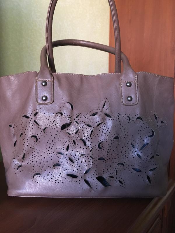 Сумка кольору кави з молоком. З перфорацією. Всередині один відділ і кишенька на блискавці. Довжина ручок 50 див.