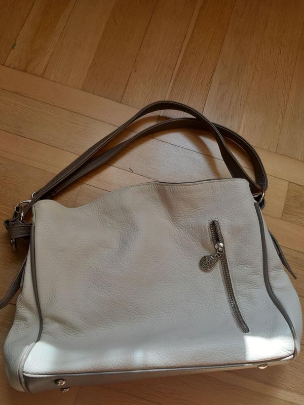 Шкіряна сумка, молочно- сірого кольору, дуже вмістка. Сумка має 2 великих відділення і маленькі кармани. Дуже гарний зовнішній вигляд.