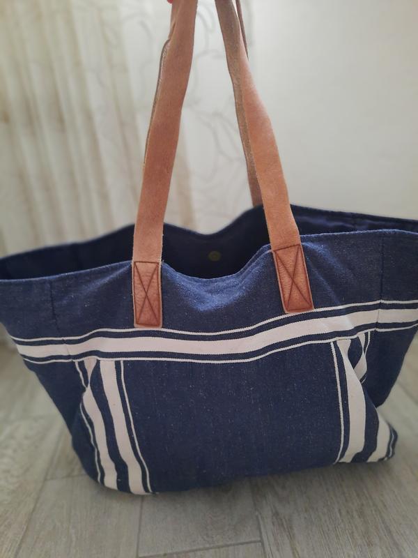 В отличном состоянии. Выполнена из плотного текстиля. Ручки кожа. Застегивается на кнопку. Замеры: ширина в расправленном виде 62cм. высота 35.5см. дно 21.5см. ручки 56см.